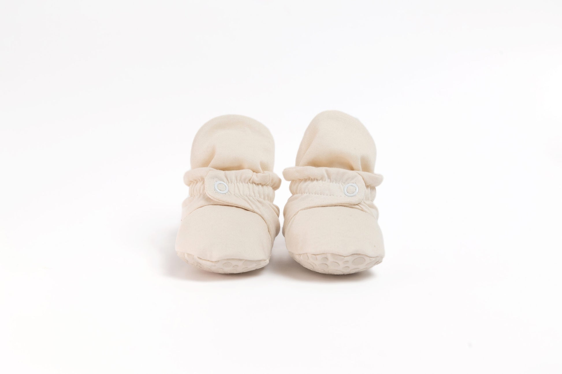 Os modelos têm formato tipo meia e são confecionados em algodão orgânico extra fino, muito respirável e confortável. Antes dos 6 meses são usados como meias de proteção, e a partir dos 6 meses incluem sola antiderrapante, ideal para quando começam a explorar o mundo com mais autonomia.